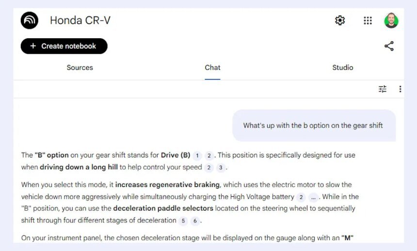 Later, after downloading a PDF of the manual from Honda’s website and then uploading it into NotebookLM, it took me all of 10 seconds to reach the same answer—simply by asking.