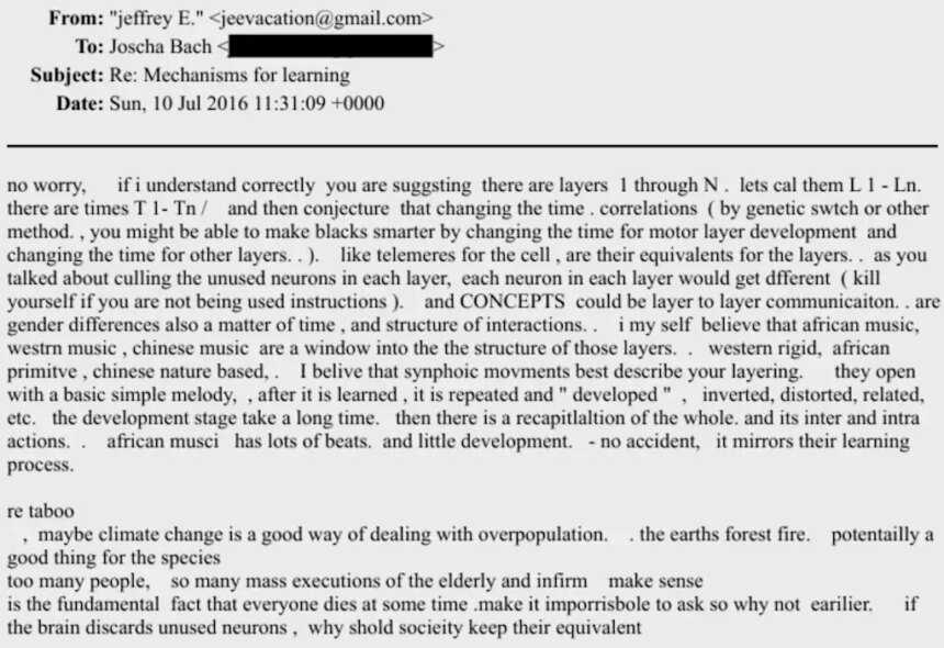 In a series of July 2016 emails with Joscha Bach, a German philosopher, AI researcher, and cognitive scientist, Epstein brings up climate change in the middle of a discussion about cognition and race.