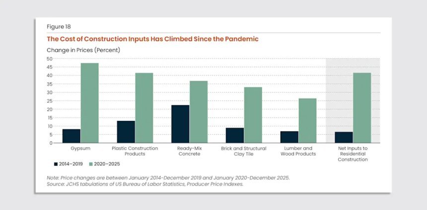 Most of the impacts from construction material costs are a direct and long-lingering result of the pandemic, according to the report, but current affairs—from tariffs to oil price shocks from the Iran war—are also having an effect on the overall cost of building.