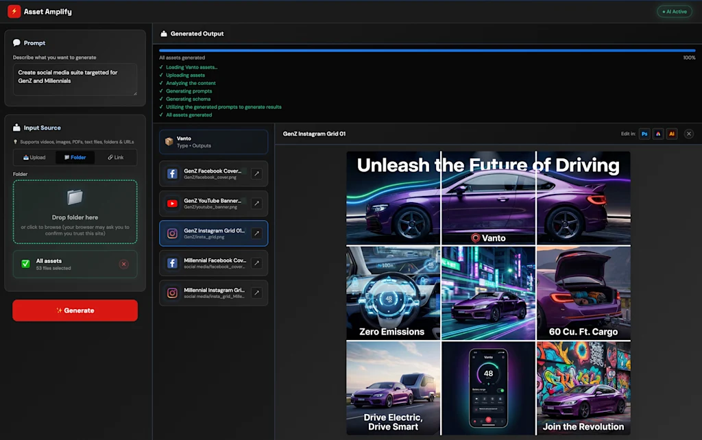 In an exclusive demo shared with Fast Company, an Adobe developer tested the tool with a fictional luxury electric car brand called Vanto. Asset Amplify was asked to generate an “interactive and immersive website” for millennials and Gen Zers—and the results were strikingly different.