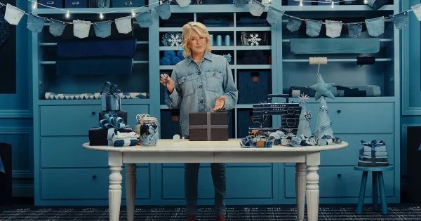 Wearing jeans in a denim-hued dreamscape, Stewart is on hand to provide holiday tips and inspiration for all ages. The retailer’s new content series, “Martha Wraps the Gifts in AE,” is a playful take on getting ready for the season, with Stewart emphasizing that jeans are a universal gift across generations.