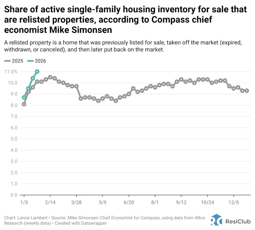 Fast-forward to January 2026, and we are indeed seeing an upswing in relistings, according to Compass chief economist Mike Simonsen’s analysis of Altos Research data.