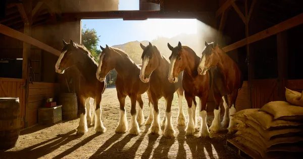 The teaser, “Stable,” is fronted by five of its iconic Clydesdale horses. The animals are shown standing shoulder-to-shoulder in their St. Louis, Mo. barn.
