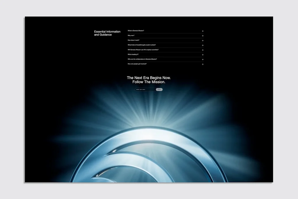 Gebbia’s Valley-inspired work is evident in other sites, too. His design for genesis.energy.gov—a new federal AI research initiative—borrows the sans serifs and black backdrops of modern Apple ads. Viewed in full, it lands as any stereotypical technology site, full of servers and glowy sci-fi nonsense (though the presentation was enough for Reddit cofounder Alexis Ohanian to proclaim “this is awesome”).