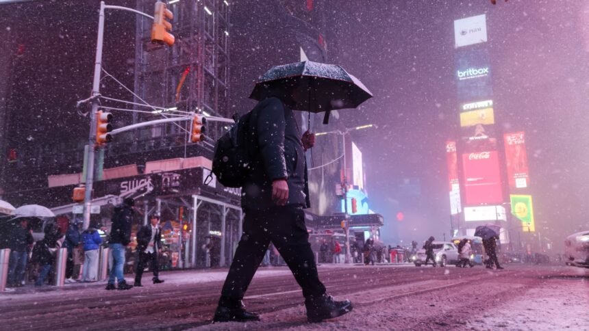 Pedestrians in the snow at Times Square during a winter storm in New York, US, on Sunday, Feb. 22, 2026.