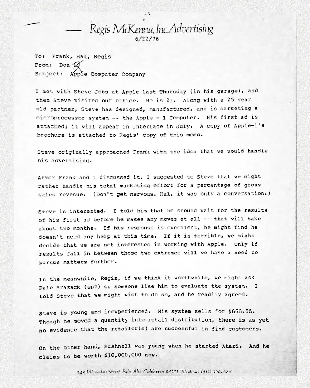 Both Bushnell and McKenna remember brokering introductions between Apple’s founders and Don Valentine of Sequoia Capital. However the meeting transpires, Valentine is skeptical about what he sees.