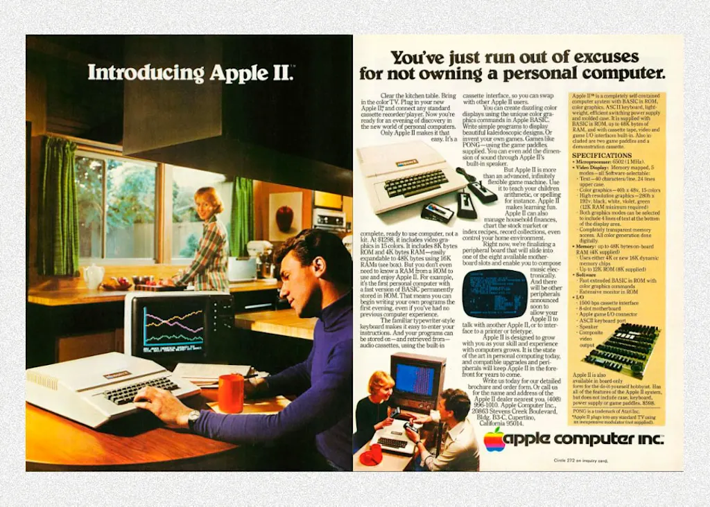 Manock’s case accommodates seven slots for add-ons such as input-output cards, extra memory, and storage—making it more readily expandable than the TRS-80 or PET—and an advanced power supply. The Apple II also comes with BASIC burned into ROM, eliminating the need to laboriously load it from cassette tape.