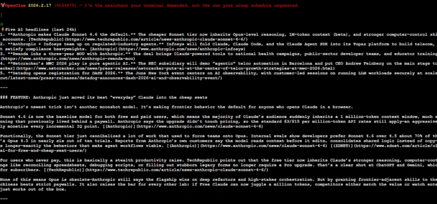 OpenClaw even captured my propensity for including data and stats in my articles. “Internal evals show developers prefer Sonnet 4.6 over 4.5 about 70% of the time and even choose it over last fall’s Opus 4.5 in nearly six out of ten trials,” the bot wrote, citing a blog post from Anthropic.