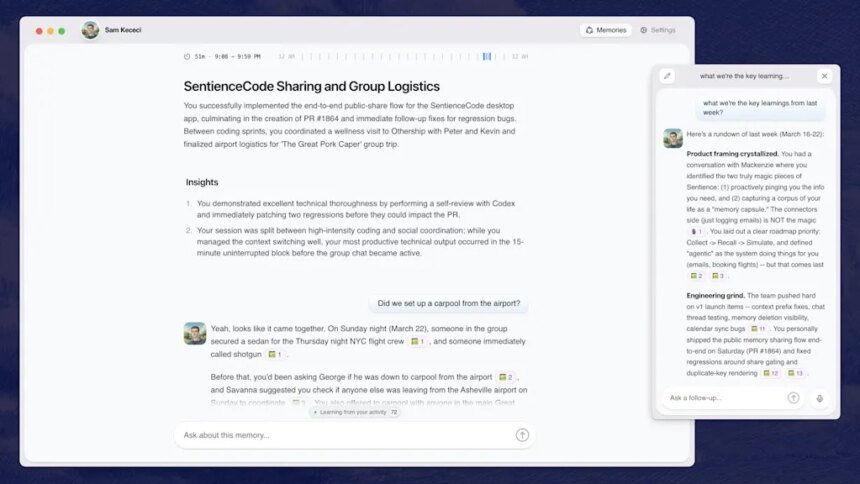“I was no longer a human being. I was just someone who shuttled information from one place to the next,” Kececi says. Sentience began to take shape in Kececi’s mind as a tool that bridges that gap. He wanted to build an AI that could perfectly remember everything he had ever created, researched, or written on his laptop, and also format that information to answer questions on his behalf.