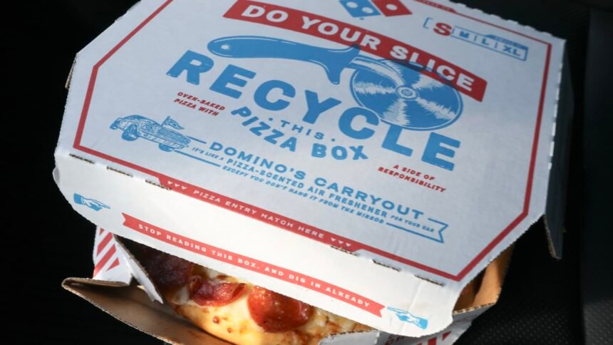 In this photo illustration, a Domino’s pizza sits in a take-out box on July 21, 2025 in Miami, Florida.