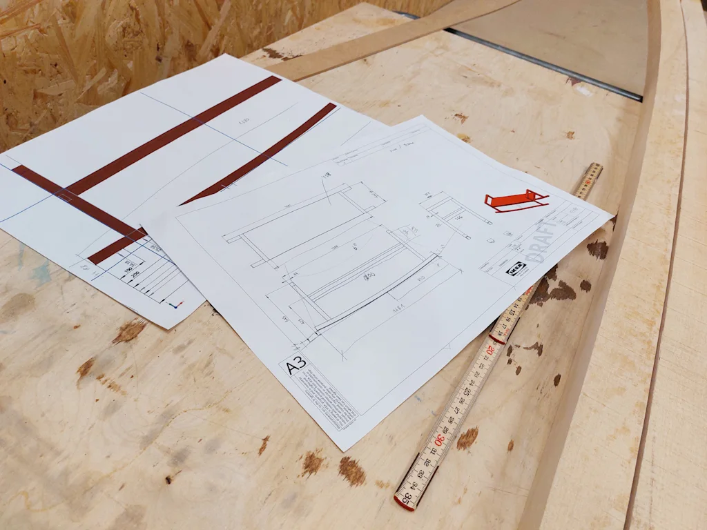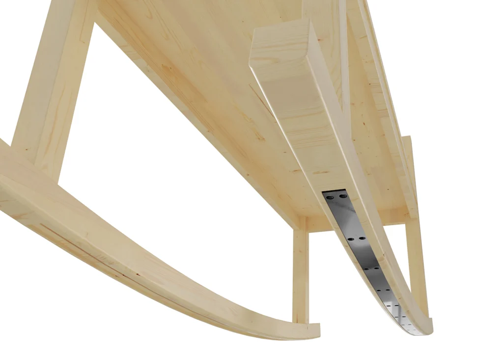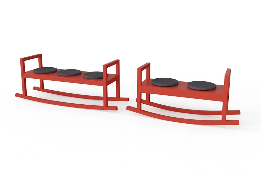 Krupińska says the idea for the rocking bench came from her inner child. “I like to do things against the rules, you know?” she says. After Larsen selected the bench to build, she couldn’t help but head straight into the prototyping shop with him. They immediately began to build the design together, at full scale. Rather than making a quick mockup, they decided to go straight to the pine that would be used for a commercial product. “We were reprimanded,” Krupińska says. “It didn’t land that well with my colleagues because they were doing very rough mockups in particle board and stuff like that.”