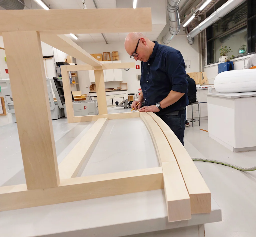 One of the most striking pieces in the new PS collection launching in May almost didn’t make it through the prototype phase. Back during the collection’s design sprint in late 2023, designer Marta Krupińska submitted a drawing showing a simple but odd wooden bench for three people. Instead of sitting flat on the ground, the bench’s design called for it to have arched runners under its front and back legs, making it wobble from side to side. Prototype engineer Fredrik Larsen rushed over to the bench drawings before any of his colleagues could. “I took the opportunity to grab it first,” Larsen says.