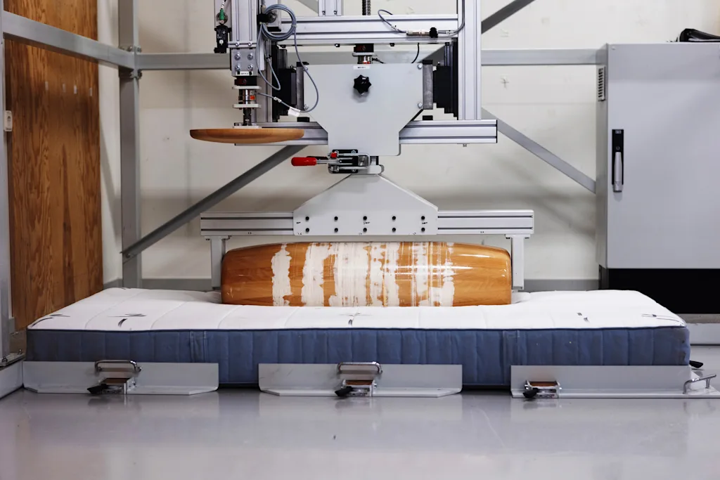 It’s high school shop class in hyperspeed: One area prints large panels of images for a textile, another is coated in sawdust, another blasts a CNC water jet cutter through a piece of sheet metal, and yet another fumes with the scent of freshly sprayed paint. Hospital white walls and smooth concrete floors contrast with the chaotic sounds of a screaming table saw, a zapping arc welder, and classic rock pouring out of a boombox.