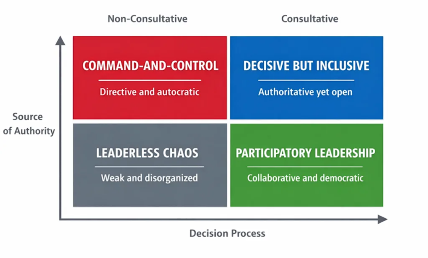 In the top-right quadrant, where authority remains centralized but the decision process is consultative, we see decisive but inclusive leadership. This approach is authoritative yet open. Leaders retain control over final decisions while actively seeking input, expertise, and dissenting views. This model tends to produce higher-quality decisions in complex environments, as it combines accountability with access to broader intelligence. Although it may appear to be time-consuming, in reality it can be carried out efficiently and effectively.