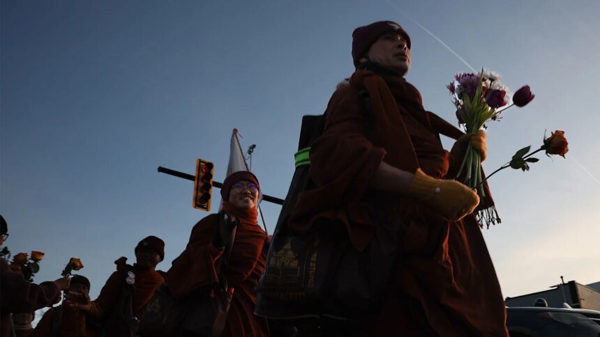 More than three months ago, a group of about 19 Buddhist monks and their rescue dog companion, Aloka, set out on a 2,300-mile walking journey to promote peace.
