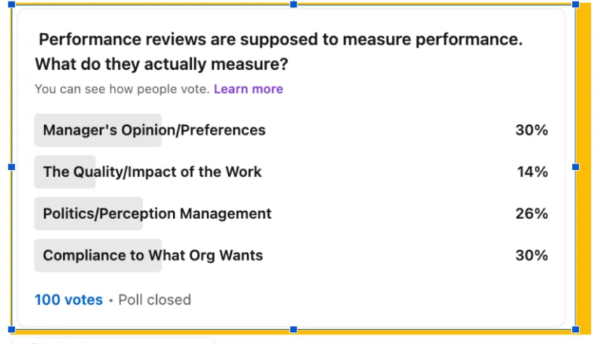 And we know it. A recent poll I did on LinkedIn shows that people truly get that performance reviews are less about the work (14%) and more about conforming to what is expected of you.