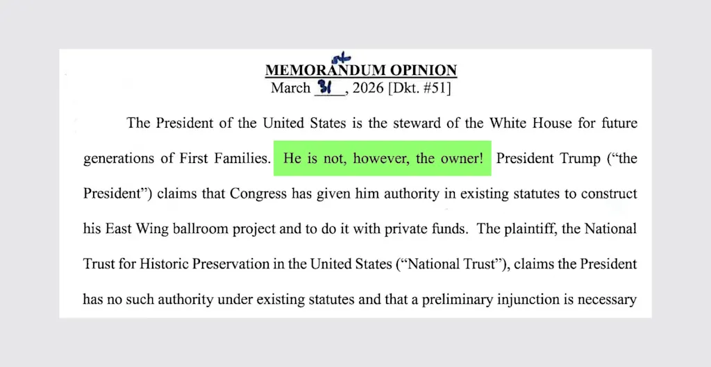 Ruling on a lawsuit filed by the National Trust for Historic Preservation, U.S. District Court Judge Richard J. Leon granted a request for a preliminary injunction against the White House ballroom, finding that Trump exceeded his authority in pursuing the project without congressional approval. Leon gave the White House—along with lead defendants the National Park Service and six other parties—14 days to appeal. The Trump administration has already appealed the ruling, and the case is almost certainly headed to the Supreme Court.