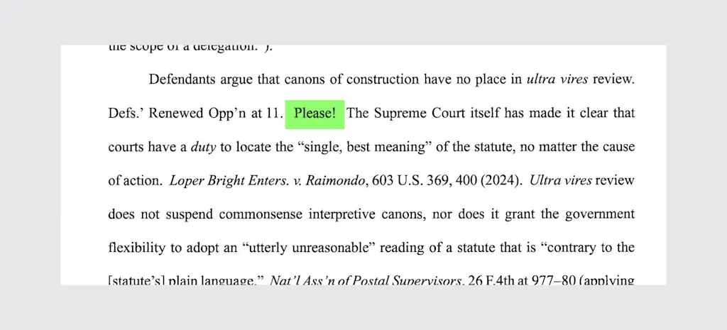 Other instances of his sarcastic “Please!” are in sections perhaps only lawyers could truly appreciate. One focuses on what does and does not belong as a precedent reference in a review known as ultra vires, or a test of whether an action is “beyond the powers” of an official. The other attempts to make the point that other donor-funded construction projects have gone ahead without formal congressional approval.