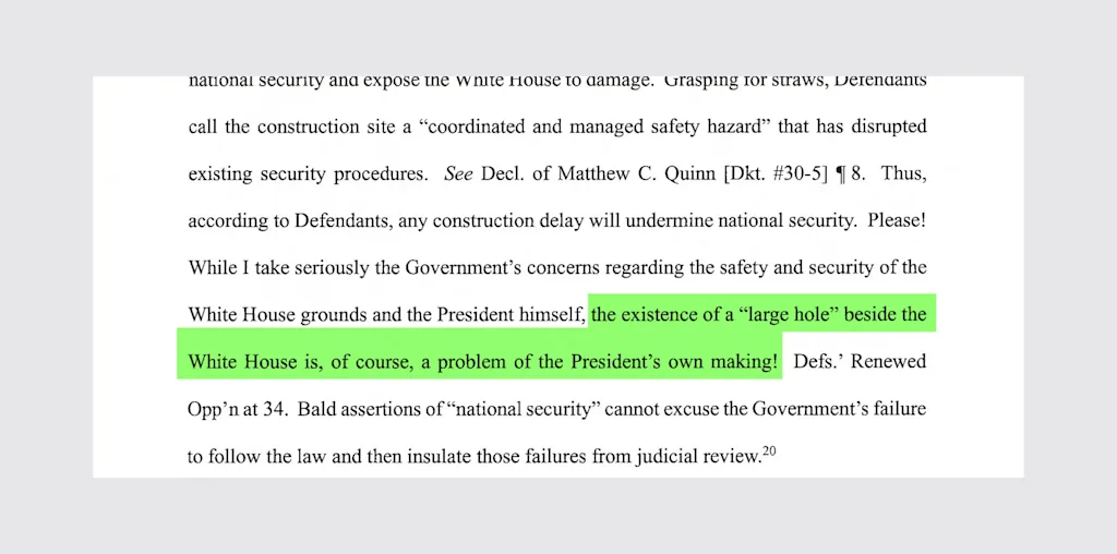 Another of the defense’s assertions is that delaying the already-started construction project could make the construction site a safety hazard that undermines national security. Leon strenuously counters. “Please! While I take seriously the Government’s concerns regarding the safety and security of the White House grounds and the President himself, the existence of a ‘large hole’ beside the White House is, of course, a problem of the President’s own making!” he writes.