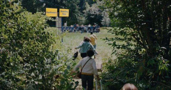 The ad opens with an announcement that Southwest boarding has begun, and The Ramones’ Blitzkrieg Bop sets the tone of the pandemonium that follows. Set in what appears to be an overgrown jungle, passengers crash through foliage, swing on vines, and then crawl over one another to get to their preferred seats.