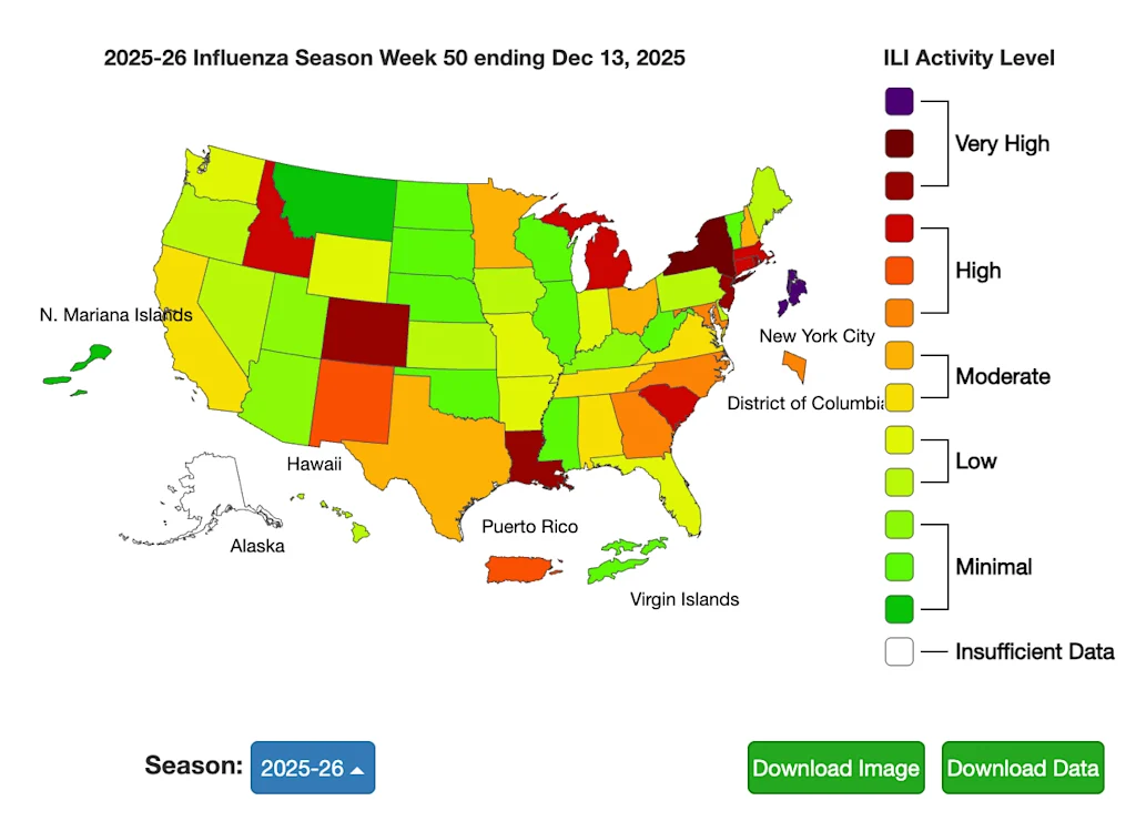 According to CDC data for the week ending December 13, 14.8% of samples tested positive for influenza.