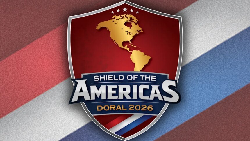 The logo is a red shield that frames a golden map of North and most of South America (its most Southern region is cut off by the initiative’s name, “Shield of the Americas,” in all caps). “Doral 2026” appears in metallic silver directly underneath the main wordmark, and angled red, white, and blue stripes sit directly below that. All the typography is set on a curved baseline, which is a common treatment for sports team logos. Gradients abound, although none share the same focal point.