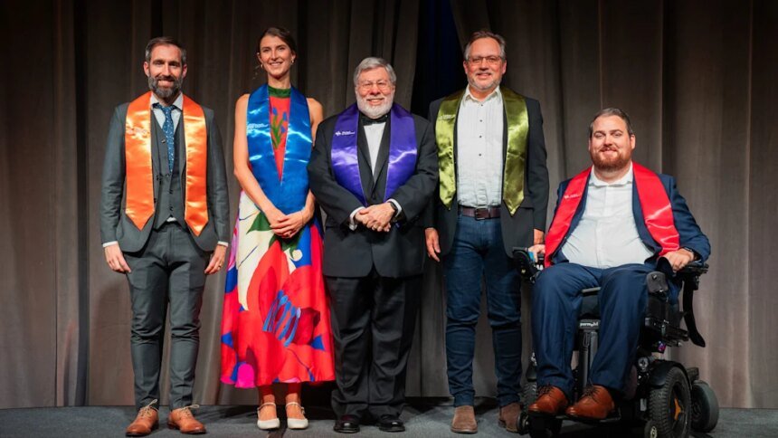 From left: Tech for Global Good Celebration honorees Jay Sanguinetti of Sanmai Technologies, Sidney Collin of NexStride, Steve Wozniak, Andreas Forsland of Cognixion, and Ian Burkhart of BCI Pioneers Coalition in San Jose, California, on January 16, 2026. [Photo: Don Feria]