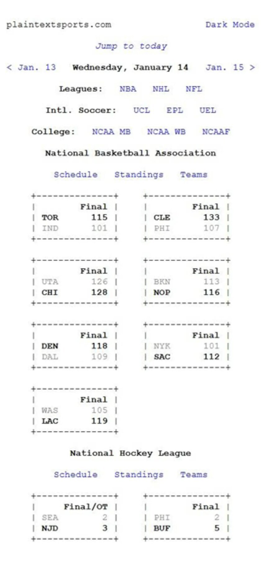 ➜ Plain Text Sports is a website that lists out sports scores using only letters, numbers, and characters.