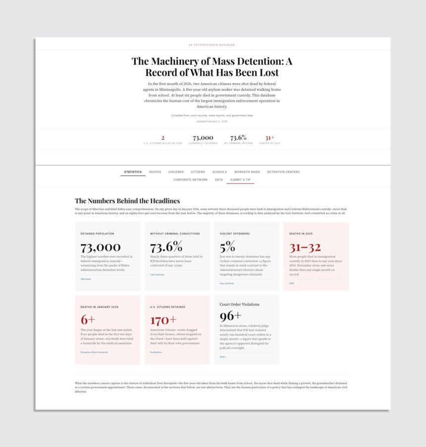 In a memo at the bottom of the site, Sparks emphasizes the human toll behind the database: “What the numbers cannot capture is the texture of individual lives disrupted—the five-year-old taken from his walk home from school, the nurse shot dead while filming a protest, the grandmother detained at a routine government appointment. These cases, documented in the sections that follow, are not abstractions. They are the human particulars of a policy that has reshaped the landscape of American civil liberties.”