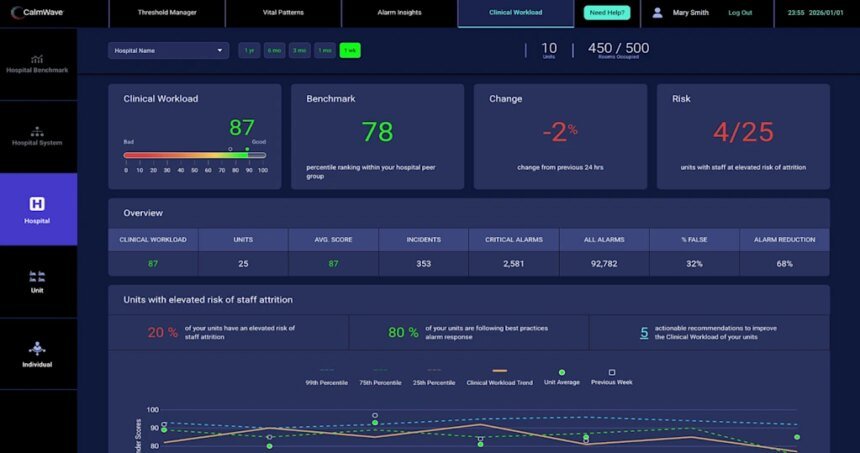 The system presents staff with a unified view of patient vital signs alongside treatment timelines, such as medication administration, reducing the need to toggle between records to assess a patient’s status. Drawing on its accumulated data, CalmWave can also recommend how to adjust alarm thresholds for specific patients, backed by clinical evidence explaining its reasoning. That might mean widening acceptable ranges to reduce unnecessary noise or tightening thresholds to catch problems earlier, according to Ronen.
