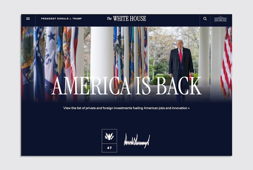 The updated website design rolled out on January 22 in the wake of a broader relaunch of government sites by the new National Design Studio. It replaces the old homepage—which featured a banner image of Trump, the bolded phrase “America is Back,” and headshots of the first lady and vice president—with a decidedly more cinematic design.