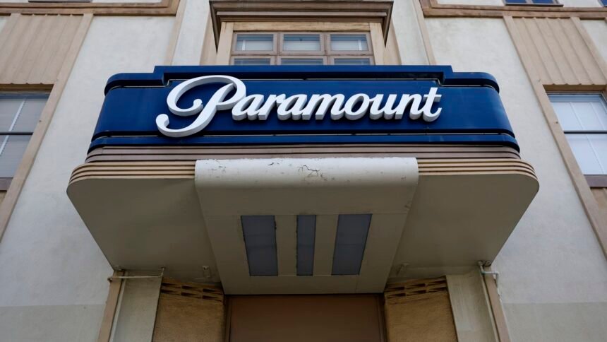 The Paramount logo is displayed above an entrance to Paramount Studios on Feb. 23, 2026 in Los Angeles, California.