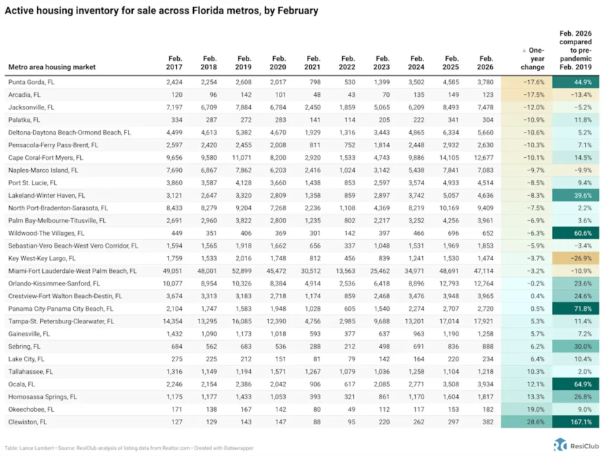 RIGHT: Year-over-year shift in active housing inventory for sale between Feb. 2025 to Feb. 2026