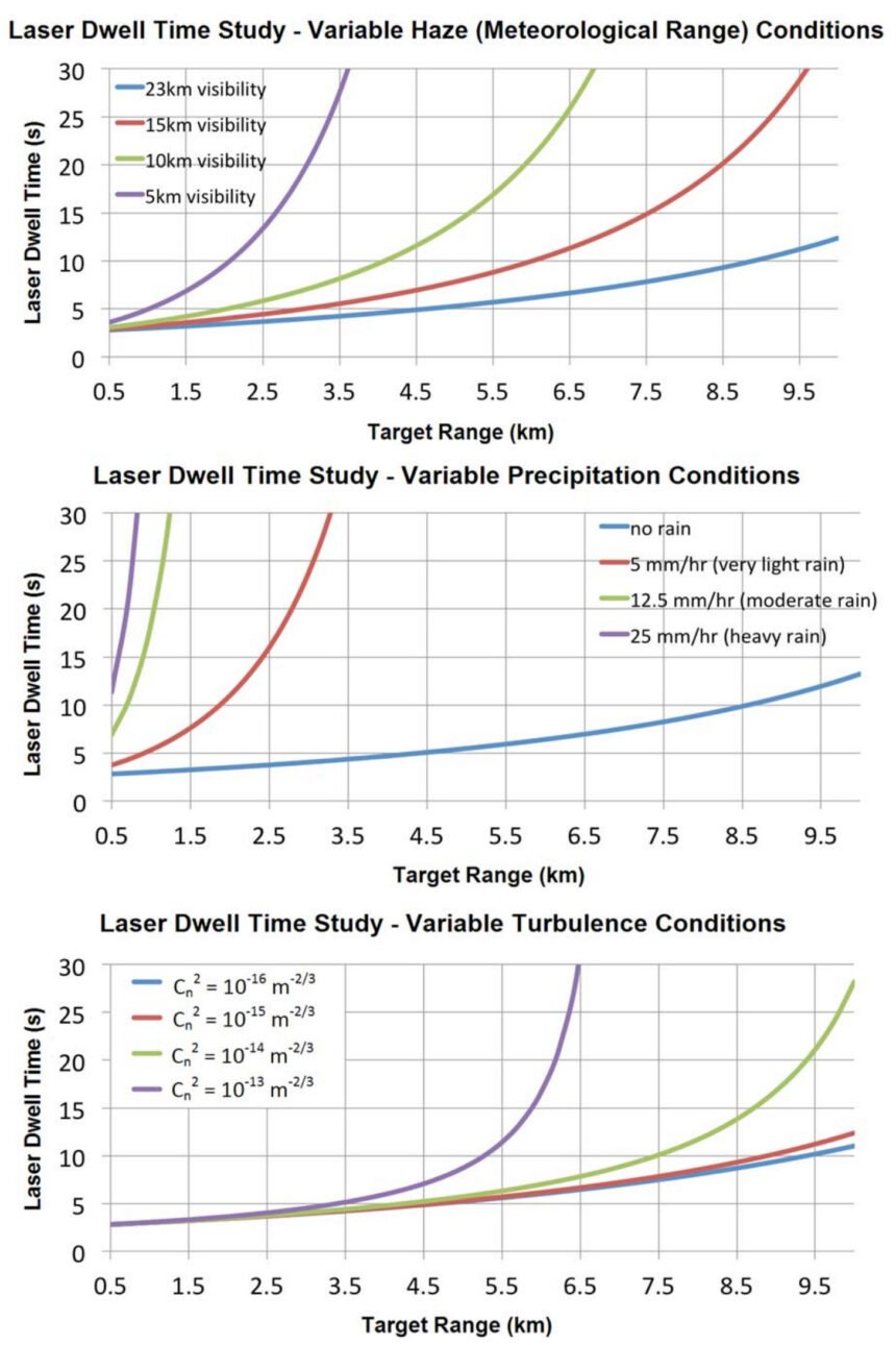 This phenomenon effectively shrinks a laser weapon’s magazine before the system actually fires a shot. A laser that can defeat a drone in three seconds in clear air may require significantly longer in maritime haze or coastal humidity; in some conditions, it may not be able to maintain sufficient beam quality to engage at useful ranges. These charts from a 2014 analysis for the U.S. Naval Postgraduate School illustrate this nicely: