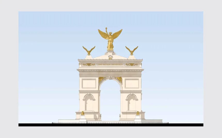 The height of the arch is a hat tip to the semiquincentennial anniversary of the nation’s founding, which will be celebrated in July. But like a skyscraper that adds a spire or antenna for a few extra feet, it gets there with some help from its ornamentation: a 60-foot winged Lady Liberty-like gold statue flanked by gold bald eagles. The rendering also shows gilded lions at the base and the phrases “ONE NATION UNDER GOD” and “LIBERTY AND JUSTICE FOR ALL” inscribed on either side.